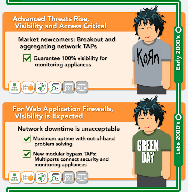In our Evolution of Network Visibility infographic, we cover the chain of events that have led us to the current state of network visibility. Just as the favorite rock bands of the decades have emerged and evolved, so too have network TAPs and security appliances.