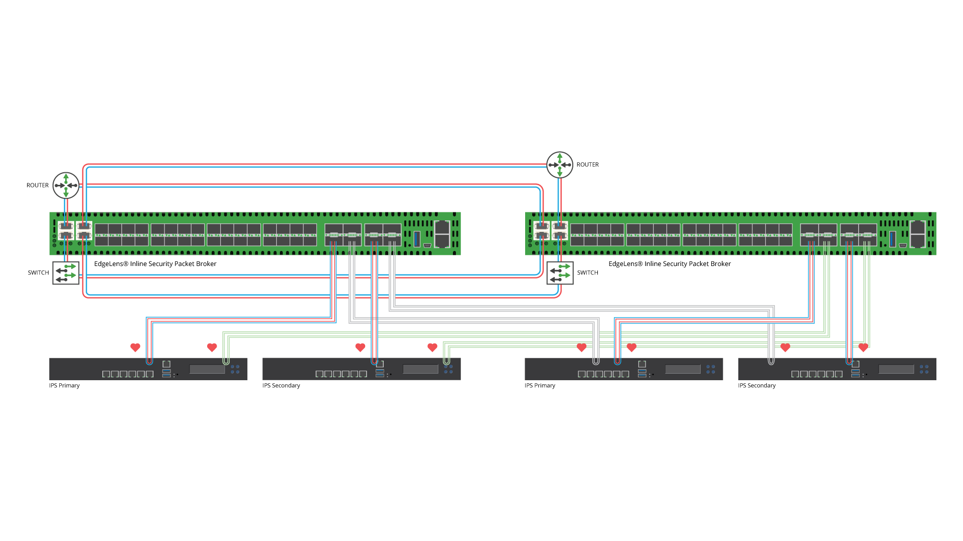 For each link deployment the IPS was deemed critical, so each EdgeLens deployed two redundant IPS tools in an active standby scenario, one IPS as the primary or “active” appliance brought inline through the EdgeLens and the secondary IPS or “passive” appliance, which still receive live traffic, but is not considered inline. This provides “Hot Standby” redundancy. In the event the primary appliance goes down and the heartbeats stop being received by the TAP, the secondary appliance will immediately and automatically take over as primary and be brought inline.